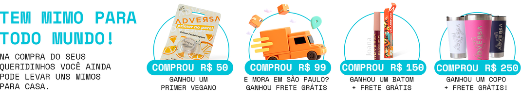 As promoções vigentes não são acumulativas, e tem validade por tempo indeterminado (exceto quando descrito) ou enquanto durarem os estoques. Frete Grátis válido para compras acima de R$ 150, válido para o Brasil todo. Envios feitos na promoção de Frete Grátis serão feitos via transportadoras à nossa escolha. O cupom de Primeira Compra é enviado após o cadastro na nossa newsletter e a confirmação do e-mail, em um terceiro e-mail contendo o código para uso em compras acima de R$ 69,00 em produtos de valor regular, o desconto não pode ser aplicado em produtos já em promoção. A Adversa se reserva o direito de cancelar ou modificar promoções sem aviso prévio. Caso haja divergência entre o preço ou descrição do produto no e-mail e no site, prevalecerá a informação contida no site. Imagens meramente ilustrativas.